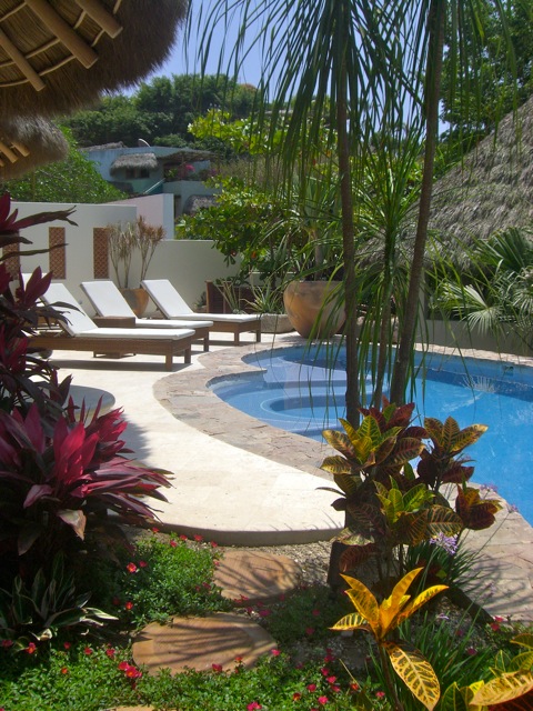 The pool was just a step below the palapa-covered patio. The gardens filled in and around and behind the buildings. Each bedroom cottage had its own pricate outdoor patio. The whole setting, behind a gated tall wall, was like walking into a small village in a jungle, with one of the bedrooms appearing to be more like a tree house than a separate cottage like the others.